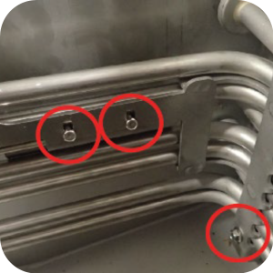 On the left front-side of the element, remove two retaining screws with a 1/4 in. nut driver, and then remove the hi-limit probe clamp.