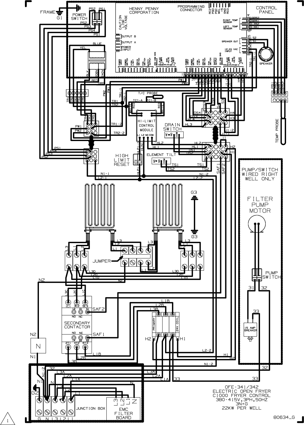 OFE and OEA 341 380/400/415VAC 50Hz, 22kw, 3N+G Drain switch wired N/O Wiring Diagram
