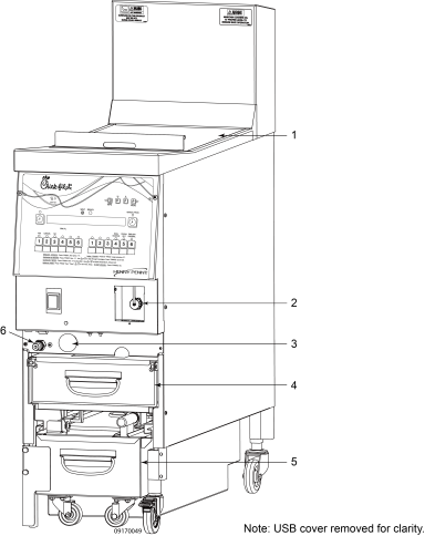 | 3 | Drain Valve Knob | Pull out black knob to open drain valve and oil drains from vat; Push in to close drain valve and oil can be pumped into vat. |