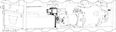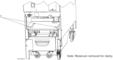 - Place the reserve oil tank onto the shelf. Ensure the studs on the bottom of the reserve oil tank are aligned with the slots (1) in the shelf .