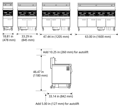 18.81 in (478 mm) | 33.29 in (845 mm) | 47.44 in (1205 mm) | 63.00 in (1600 mm) |