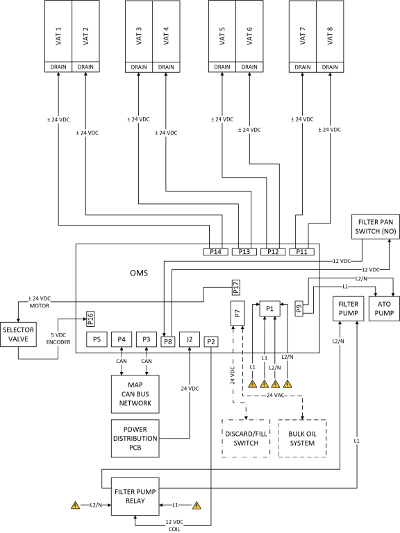 Tracking of oil movement along with filter queuing and logic is managed by the OMS PCB. Primarily, the OMS is powered by 24 volts DC from the Power Distribution PCB. Additionally, line voltage is supplied to the OMS by two of the 15 A push button circuit breakers. Incoming to the OMS are selector valve encoder position and bulk oil system signals. Outputs of the OMS are 24 volts DC to the selector valve motor, and drain valve actuators for all vats. Additional OMS outputs are line voltage to energize the filter and ATO pumps. A filter pan magnetic proximity switch circuit is monitored by the OMS and is closed with the pan in place, or open with the pan out.