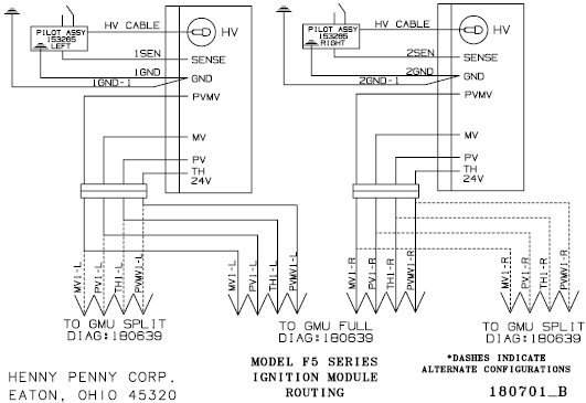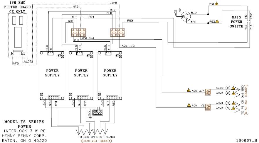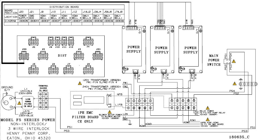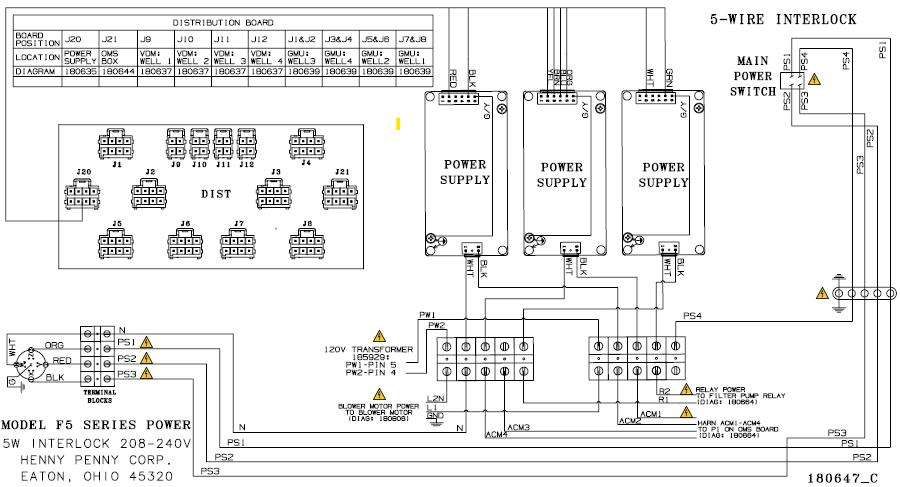 208 – 240V Power supply power distribution wiring diagrams labeled on unit