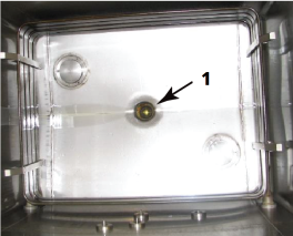 Once all the oil drains into the drain pan, visually inspect the drain and valve (1).